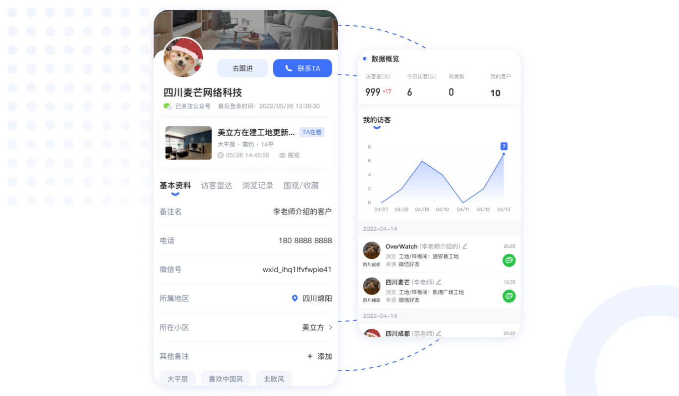 精準(zhǔn)引流,客戶軌跡追蹤推送、深度洞察客戶需求。 快速鎖客,直接對(duì)話消息及時(shí)提醒,增加量房量為銷售賦能。