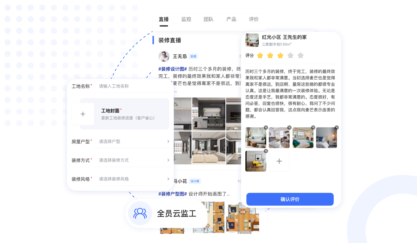 工地實(shí)時(shí)監(jiān)控直播,業(yè)主足不出戶,實(shí)時(shí)觀看裝修現(xiàn)場(chǎng),工地圖文,視頻,VR全景實(shí)時(shí)更新,保證裝修進(jìn)度。